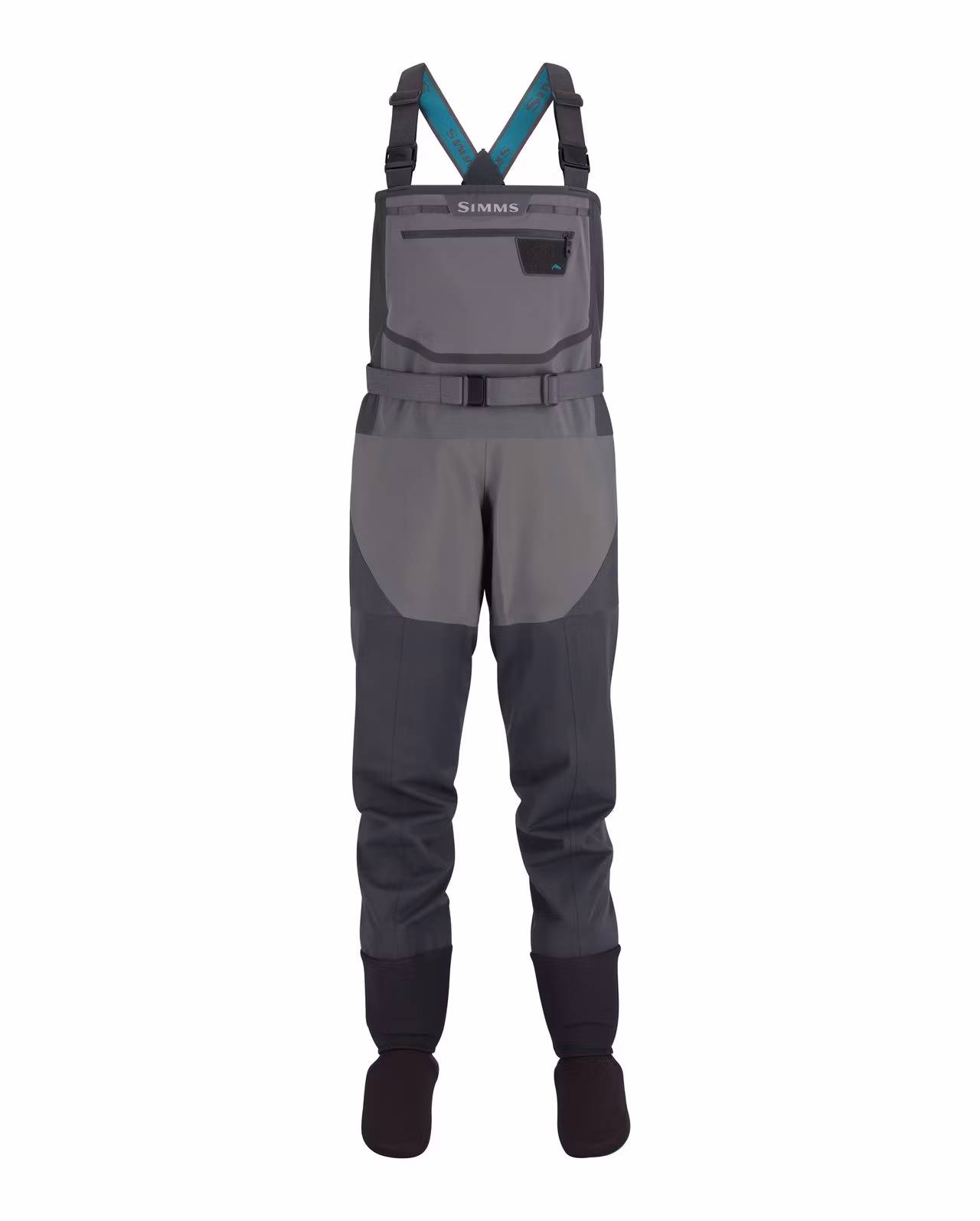 - Stretch elastic suspenders with Simms custom opposing male and female buckles for easy waist-high conversion